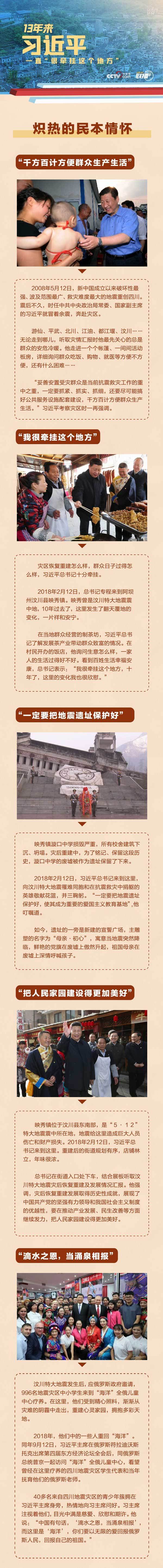 今年5月12日是汶川地震13周年纪念日。汶川地震发生后不久,时任中共中央政治局常委、国家副主席的习近平就冒着余震,奔赴灾区。多年来,习近平一直“很牵挂这个地方”,关心灾区居民和灾后恢复重建发展情况;出访俄罗斯时还特意看望曾经在“海洋”全俄儿童中心疗养的四川地震灾区学生代表。