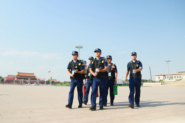 图为蔡瑞(右一)带领指战员们在天安门广场巡逻检查。受访者供图