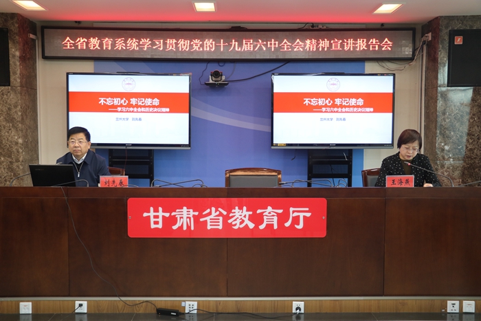 11月29日,全省教育系统学习宣传贯彻党的十九届六中全会精神专题宣讲报告会在兰召开,兰州大学马克思主义学院教授刘先春作专题辅导,省委教育工委书记,省教育厅党组书记、厅长王海燕主持会议并讲话。