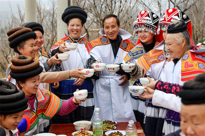 在位于乌蒙山区腹地的贵州省毕节市纳雍县,村民马雍(右五)与妻子黄国琴(左五)在年夜饭上与大家干杯(2021年2月11日摄)。(新华社记者 欧东衢/摄)