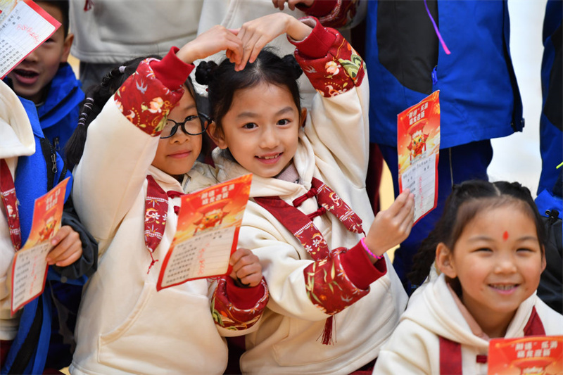 在湖南省长沙市天心区的湖南师大附中双语实验学校,一年级学生在趣味闯关活动中展示自己的闯关卡片(2024年1月18日摄)。(新华社记者 陈泽国/摄)