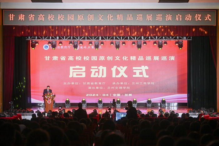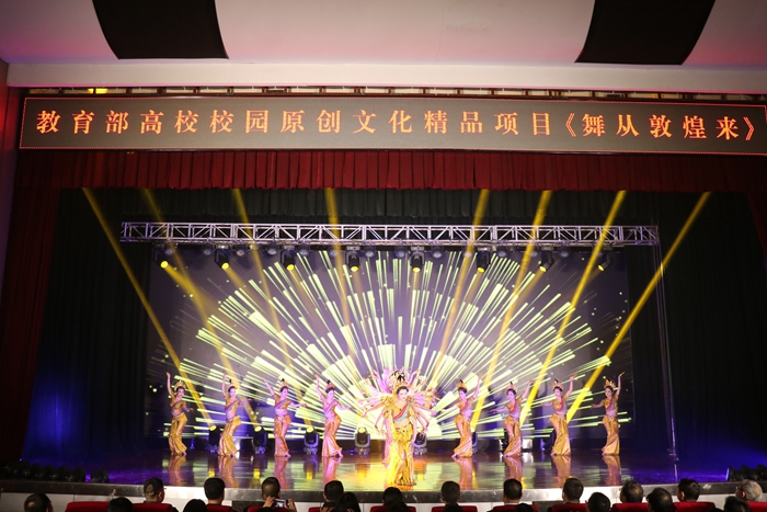 为深入学习宣传贯彻习近平文化思想,深化转化高校学习贯彻习近平新时代中国特色社会主义思想主题教育成果,推动各高校深入落实“时代新人铸魂工程”,4月17日,甘肃省高校校园原创文化精品巡展巡演在兰州工商学院正式启动,在兰高校宣传部门负责同志及兰州工商学院师生代表共计 800余人,共同观看了兰州文理学院原创舞台剧《舞从敦煌来》。