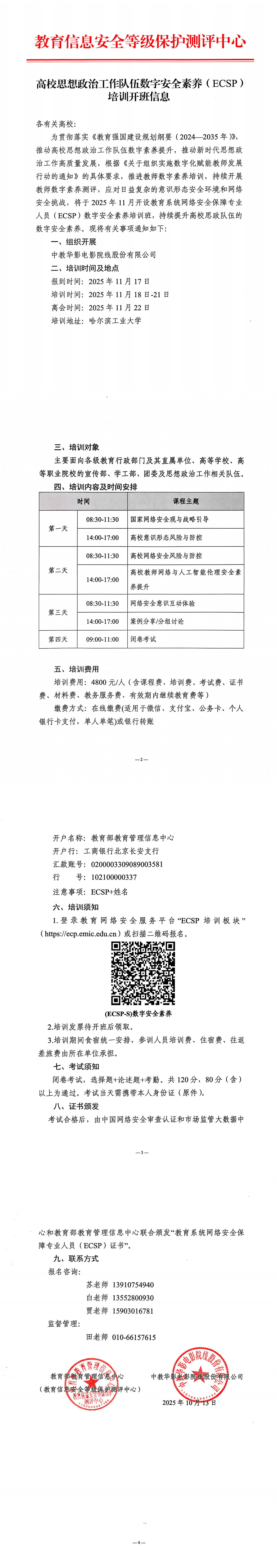 为贯彻落实《教育强国建设规划纲要(2024—2035年)》,推动高校思想政治工作队伍数字素养提升,推动新时代思想政治工作高质量发展,根据《关于组织实施数字化赋能教师发展行动的通知》的具体要求,推进教师数字素养培训,持续开展教师数字素养测评,应对日益复杂的意识形态安全环境和网络安全挑战,将于2025年11月开设教育系统网络安全保障专业人员(ECSP)数字安全素养培训班,持续提升高校思政队伍的数字安全素养。现将有关事项通知如下: