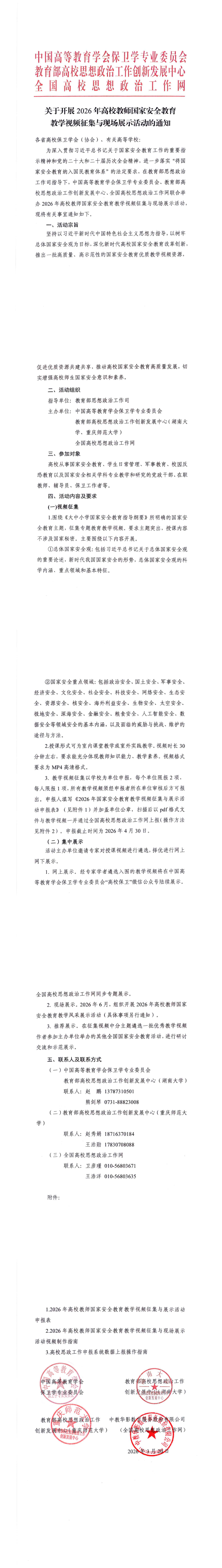 为深入贯彻习近平总书记关于国家安全教育工作的重要指示精神和党的二十大和二十届历次全会精神,进一步落实“将国家安全教育纳入国民教育体系”的法定要求,在教育部思想政治工作司指导下,中国高等教育学会保卫学专业委员会、教育部高校思想政治工作创新发展中心、全国高校思想政治工作网联合举办2026年高校教师国家安全教育教学视频征集与现场展示活动,现将有关事宜通知如下。