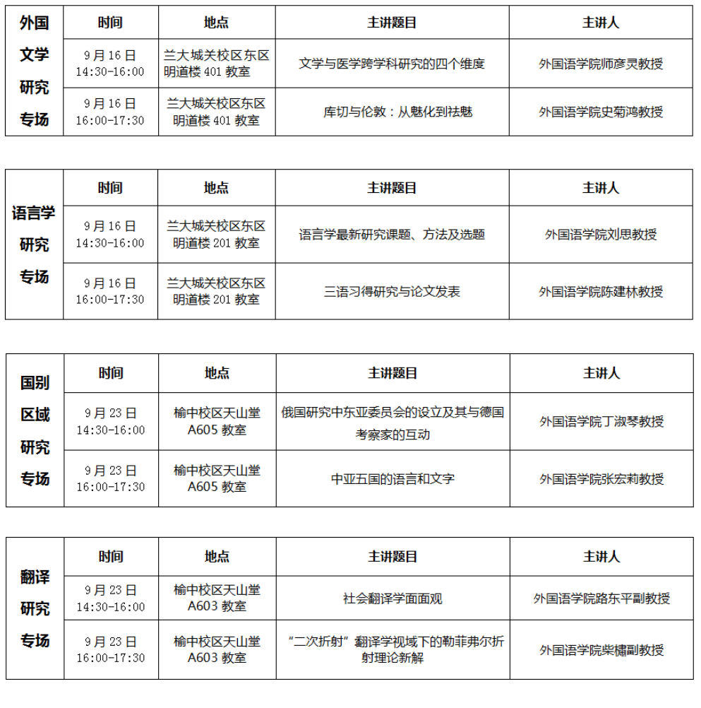 为进一步营造外国语学院学术氛围,提升师生科研素养,学院将每年九月定为外国语学院校庆学术活动月,邀请业内专家和学者与学院师生交流互动。近期,外国语学院组织安排校内老师进行外国文学研究专场、语言学研究专场、国别区域研究专场及翻译研究专场学术讲座,欢迎广大师生积极参加!