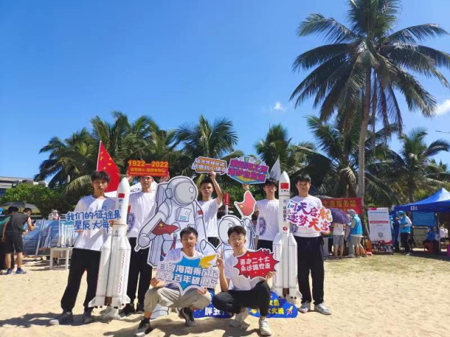 这群青年,是兰州交通大学“‘自贸海南乘风起,青春百年破浪行’重走习近平总书记在海南考察路线暑期社会实践团”成员。在发射现场,他们与北京航空航天大学、南京航空航天大学等高校的暑期社会实践团学子相聚海滩,一起见证这激动人心的时刻。