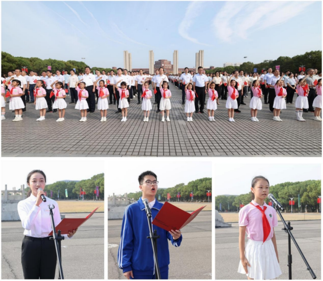 学校举行2025年国庆升旗仪式,来自文学院、附属中学、附属小学的大中小学生依次代表发言