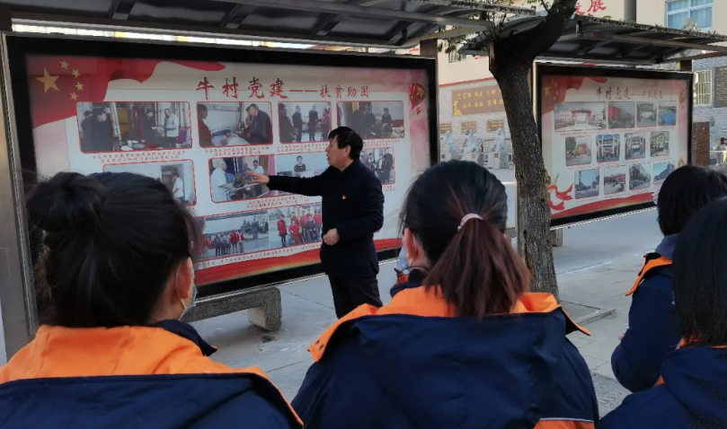 “工作老黄牛,为民孺子牛,发展拓荒牛”,在党建一条街“同心街”,牛子福为同学们详细介绍了牛村的党建工作和“党建强,牛村牛,集体富,村民乐”的工作目标。