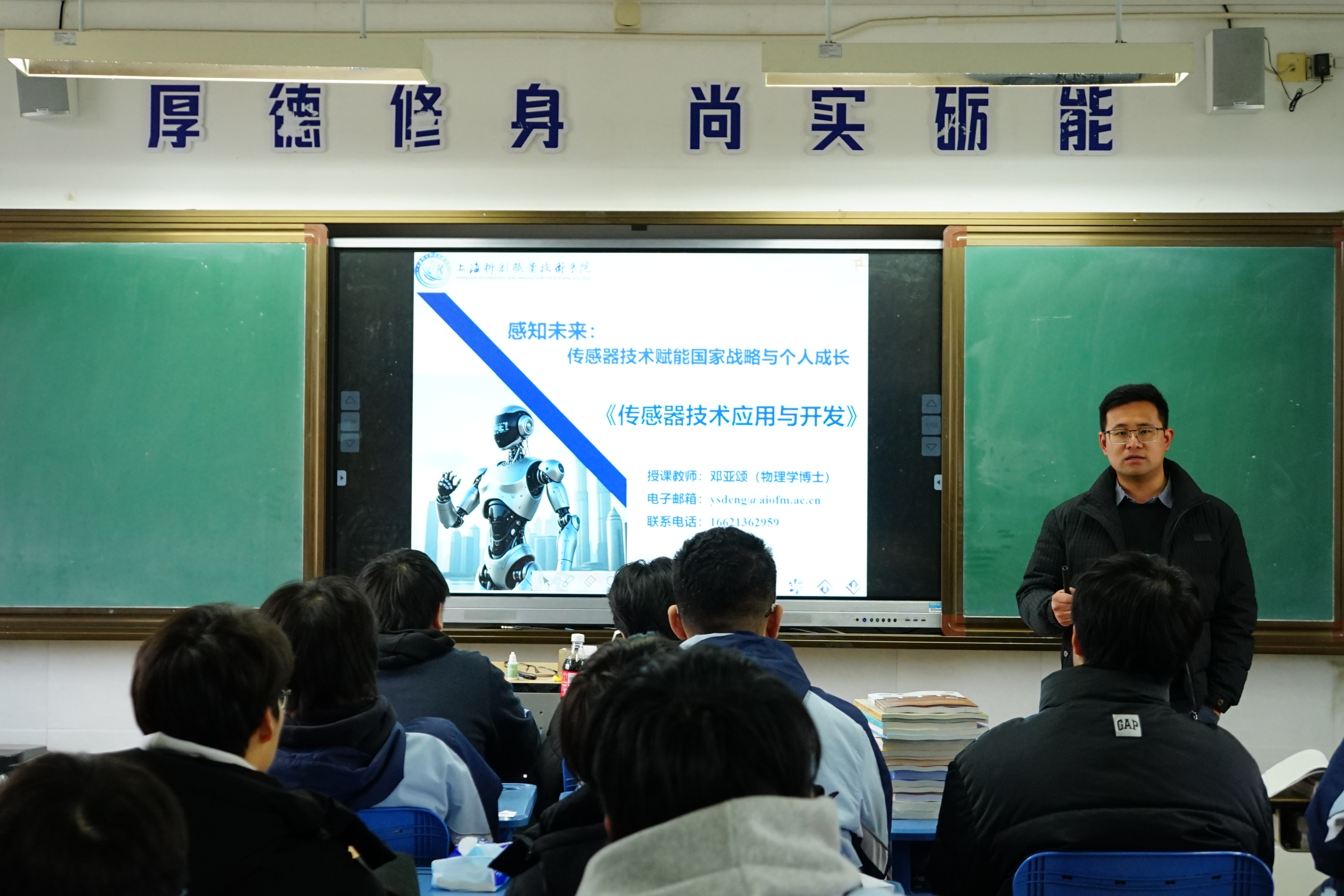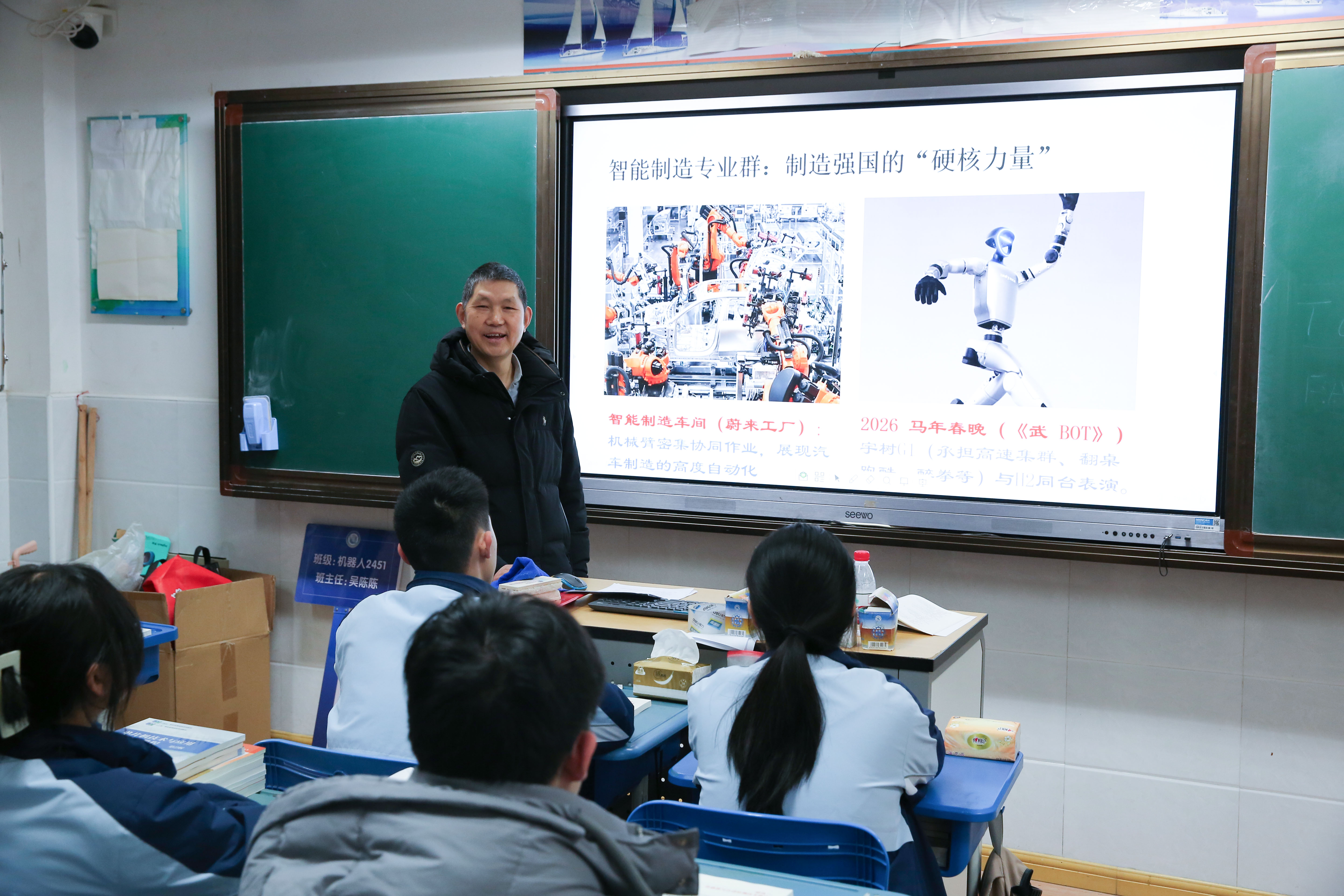 “专业导论课”将专业发展置于区域产业布局中审视。课堂上,各专业教师通过数据与案例,向学生展示了学校智能制造、智能汽车、智能建造、智慧服务四大专业集群与区域重点产业的深度对接:工业机器人技术专业群入选上海市新一轮高水平高职专业群建设立项名单,全面覆盖先进制造全产业链;新能源汽车技术专业对接松江集聚的保隆科技、鑫浩汽车检测等汽车零部件制造和检测企业;智能建造专业参与上海城市更新行动;智慧服务专业服务数字贸易新业态。