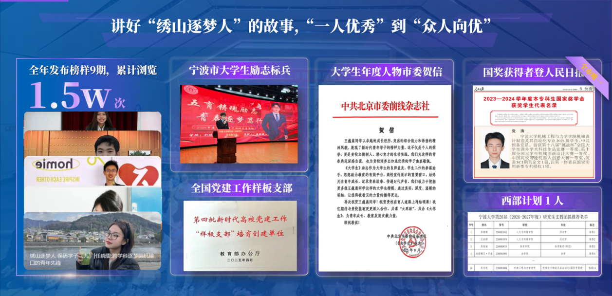 三是依托“表彰性仪式教育”,树立榜样标杆。通过评选“科研之星”“道德之星”“科普之星”等荣誉,设置“青春逐梦人”等宣传专栏,持续选树学生榜样、讲好成长故事,激发全体学生的奋进动力。实施科学素养教育“大思政课”以来,学院育人工作取得显著成效,其中,1名本科生荣获国家奖学金并被《人民日报》报道,涌现出2名浙江省高校“研究生党员标兵”、4名宁波市高校“大学生励志标兵”等。