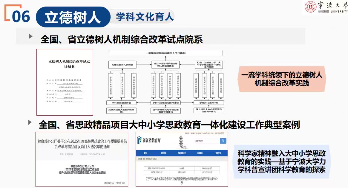 宁波大学深入学习贯彻习近平总书记关于青年工作的重要思想、关于教育的重要论述,坚持“培养一流人才、建设一流学科”定位,探索构建“内容、阵地、主体、时序”四维融合的思政育人新模式,着力破解思政工作形式与内容脱节、理论与实践割裂、德育与专业疏离等难题,推动学生思想政治工作有机融入立德树人根本任务。其中,机械工程与力学学院探索形成的“科学家精神融入大中小学思政教育的实践模式”入选2025年度教育部高校思想政治工作质量提升综合改革与精品建设项目,学院获评2025年全国立德树人机制综合改革试点院系。
