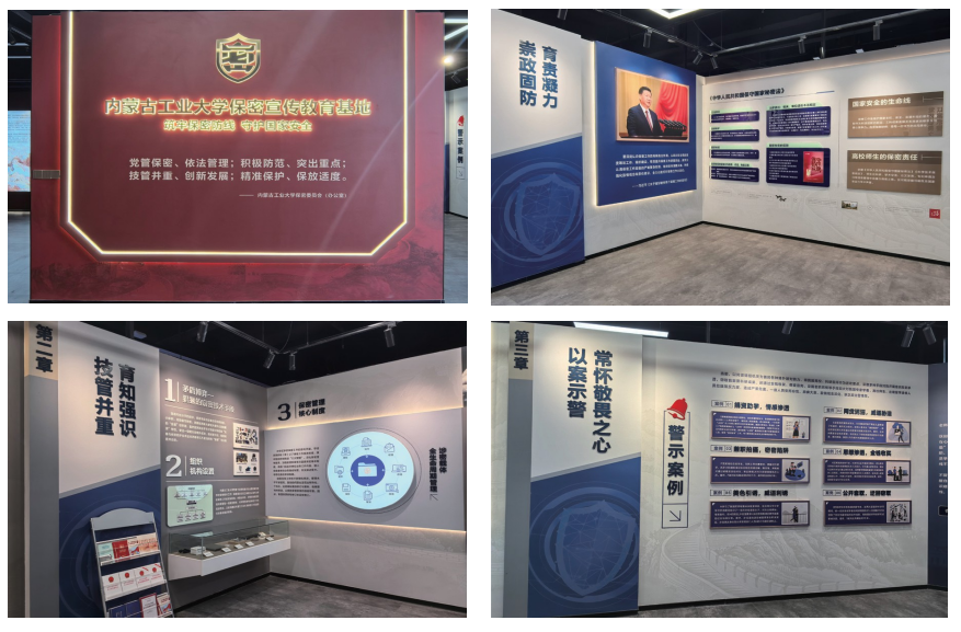 3. 保密教育主题展:学校贯彻总体国家安全观,开展保密宣传教育,守护国家秘密,筑牢校园安全防线的重要教育阵地。该展厅以提升全校师生保密意识与责任担当为核心宗旨,通过图文展板,案例解析等多元形式,系统呈现保密工作的历史沿革,法律法规,规范要求与新时代使命任务,同时设置保密科技融合,特色保密文化建设,学校保密工作开展情况三大核心展示板块,全方位,多维度地展现保密工作的重要意义与实践要求,引导广大师生深刻认识保密工作的极端重要性,自觉成为国家秘密的守护者,校园安全的践行者,切实筑牢国家安全人民防线,为守护祖国北疆安全屏障贡献青春力量。