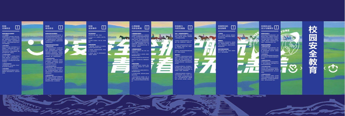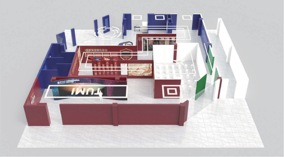 1.国家安全教育专区:整体设计采用翻转展板构造,通过文字,图片,视频,模型及互动装置,系统阐释习近平关于总体国家安全观重要论述,总体国家安全观的核心要义与我国国防现代化辉煌成就。内容包括:政治安全,国土安全,军事安全,经济安全,文化安全,社会安全,斗技安全,网络安全,生态安全,资源安全,核安全,海外利益安全以及太空,深海,极地,生物等不断拓展的新型领域安全。同时,结合内蒙古边疆特色,生动展现各族儿女军民融合,守望相助,共同守护祖国边境稳定的动人篇章,旨在强化全体同学的国家安全意识与"边疆安全无小事"的使命认同。