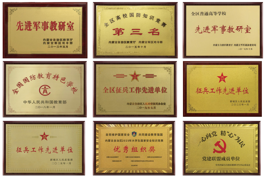 2013年被评为内蒙古自治区先进军事教研室,2015年获得全区高校国防知识竞赛第三名,2017年被评为内蒙古自治区先进军事教研室,2018年获得全国国防教育特色学校,2019年、2020年、2025年分别获得全区征兵工作先进单位。