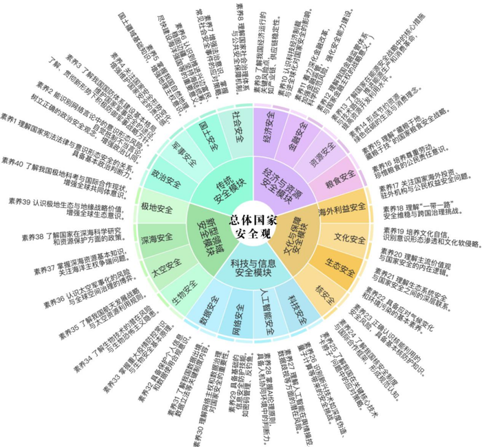 党的二十大报告强调,“国家安全是民族复兴的根基,社会稳定是国家强盛的前提”,深刻揭示了安全稳定与国家发展、民族复兴之间的本质联系。教育承担着为党育人、为国育才的使命,2020年教育部发布的《大中小学国家安全教育指导纲要》提出要“构建具有中国特色的国家安全教育体系,系统推进国家安全教育进课程、进教材、进校园”,这一政策导向深刻把握了国家安全教育与人才培养的内在逻辑,凸显了国家安全的战略地位,为国民教育体系注入了安全育人的核心要义。当前,高校国家安全教育普遍存在育人要求不具体、实施体系不完善、评价机制不健全等问题,致使大学生安全意识、能力参差不齐,危害国家安全的舆论、事件时有发生。在此背景下,高校国家安全教育S5-20-40安全素养模型应需而生。该模型衔接高中学段国家安全教育要求,将安全教育要求、要点按照5大安全模块-20个安全领域细化为40条安全素养,开发形成S5-20-40安全素养模型,将安全教育要求转化为可量化、可落实的指标,明确安全教育核心指向。S5-20-40安全素养模型涵盖总体国家安全观的传统与非传统安全领域,实现国家安全教育目标与高校教学实践的精准对接,推动国家安全教育实现全员普及与靶向对接。
